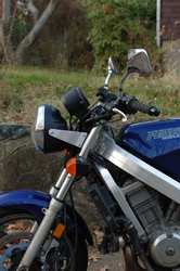 CB600F/Hornet/599 headlight on a Hawk GTThe obvious next step after making the stock headlight work as well as it possibly can is to find the best replacement headlight that's easy to install and looks right on the bike. I believe the CB600F/Hornet/599 headlight is that headlight. The Hawk's stock reflector, although perfectly adequate when powered correctly, suffers from several things: